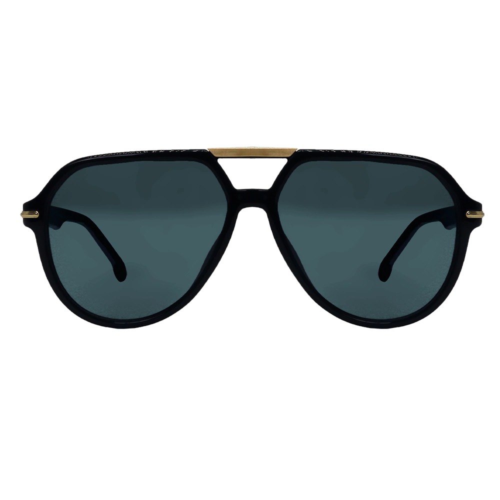 Seu design aviador combina acetato italiano preto brilhante com detalhes metálicos dourados, criando um visual refinado e imponente.